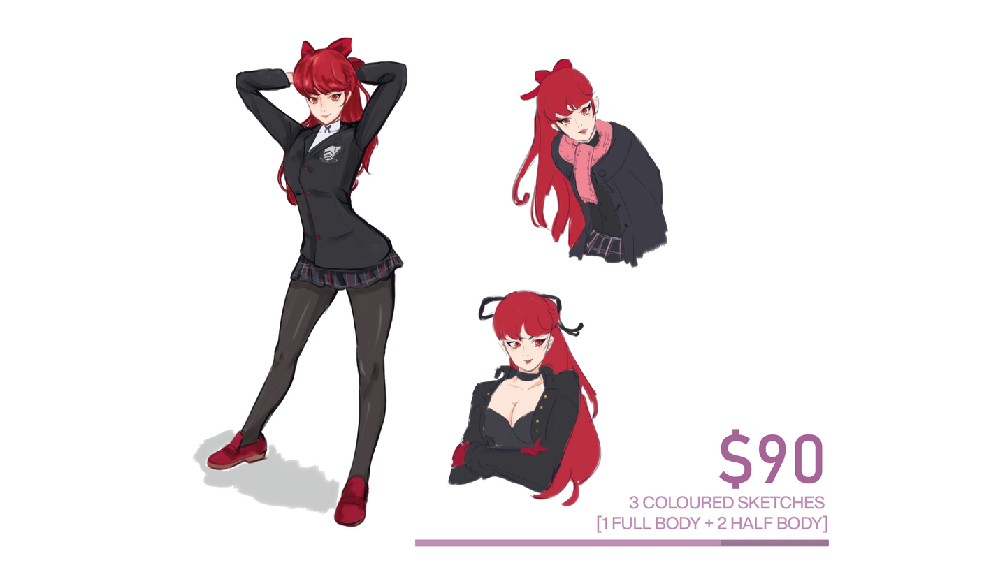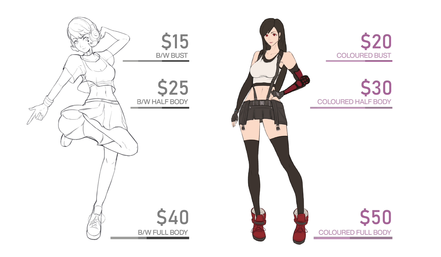 These these prices and terms are just for personal use commissions. Commercial works will have to be negotiated in private.